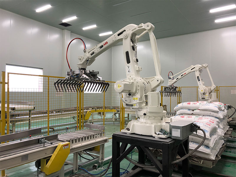糖廠使用碼垛機(jī)器人生產(chǎn)線現(xiàn)場