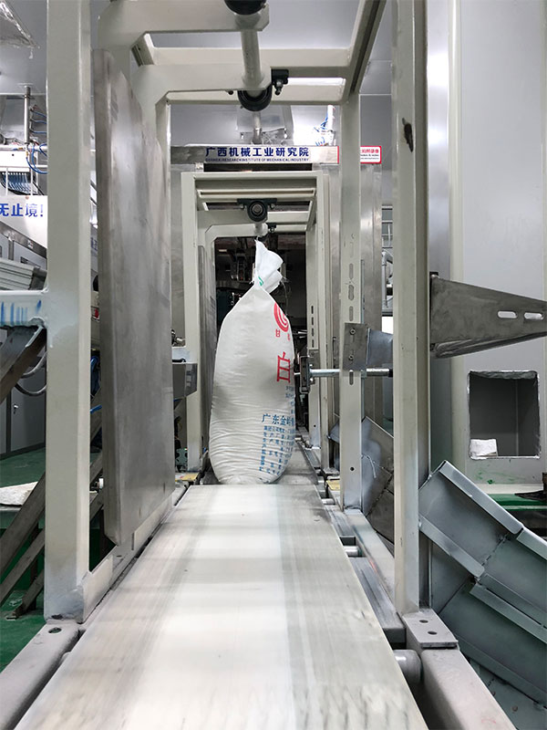 糖廠使用套裝式內(nèi)外袋全自動包裝碼垛機(jī)器人生產(chǎn)線現(xiàn)場
