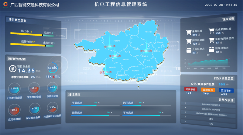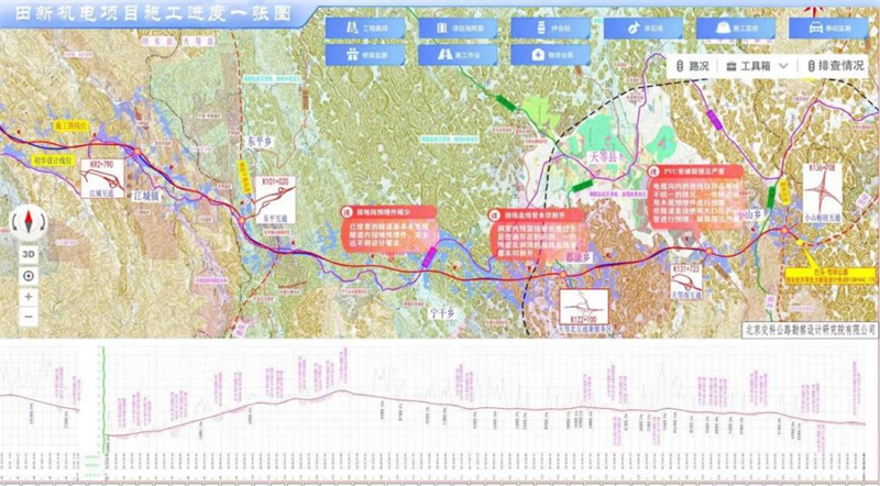 團隊還自主研發(fā)并啟用田新機電項目工程信息管理系統(tǒng),該系統(tǒng)可實現工程信息可視化、過程管理信息化、工程管控智能化,形成“施工進度一張圖”,可以直觀地展現田新路整體施工情況,極大地優(yōu)化了施工人員及車輛、安全隱患情況、質量管理、進度管理、變更情況的管理,提升了項目部對施工的管控力度,做到了危險源精準識別管控,保障了項目施工的安全平穩(wěn)運行,同時為人力資源調配、設備物資采購及調撥提供了極大參考價值。
