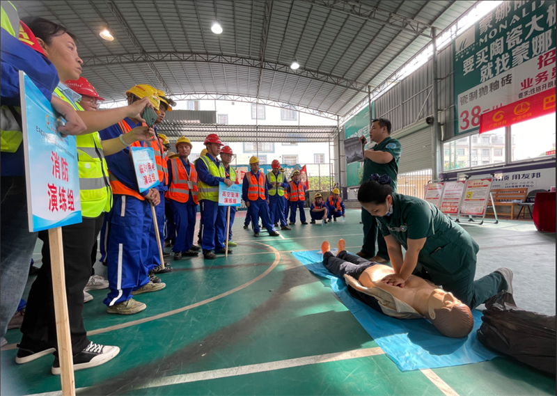 醫(yī)護(hù)人員現(xiàn)場示范中暑急救、胸外擠壓急救措施、人工呼吸方法、骨傷綁扎固定等應(yīng)急救援措施