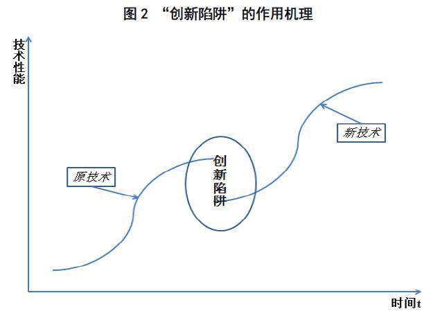 “創(chuàng)新陷阱”正是產(chǎn)生于這種新舊技術(shù)的更替過程中(參見圖2)。具體來說,對于一家企業(yè),從原有技術(shù)軌道跨向新技術(shù)軌道是一件不容易的事情;企業(yè)越是在自己原有的技術(shù)專長上加以創(chuàng)新,便會在原有技術(shù)軌道上走得越遠(yuǎn);也正因?yàn)槿绱耍髽I(yè)也便越會延滯進(jìn)入新的技術(shù)軌道,進(jìn)而也越來越遭受舊技術(shù)極限的扼制。