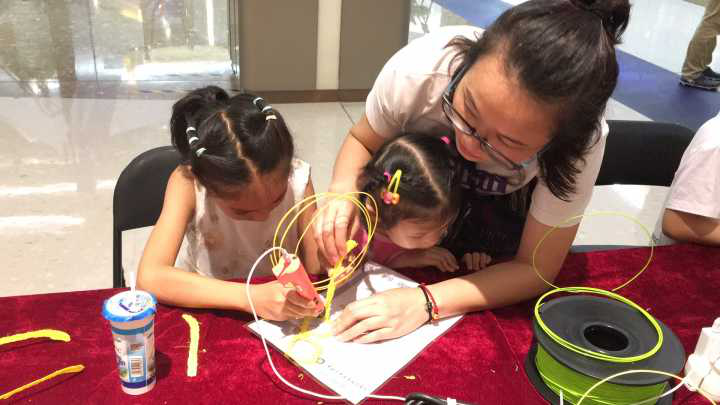 “3D·啟智·童(同)樂”展區(qū)主要結(jié)合“六一”主題和三祺廣場“新教育”的區(qū)位優(yōu)勢,開展面向兒童的3D打印科普親子體驗活動。無論是3D打印筆區(qū)域、3D打印機(jī)區(qū)域都內(nèi)容豐富,過程有趣,吸引了絡(luò)繹不絕的人群圍觀,尤其是3D打印煎餅和巧克力成了大家的注腳點,邊看邊嘖嘖稱奇。孩子們可以體驗DIY美食的樂趣,可以實現(xiàn)畫出立體的圖畫,傳遞了科普的知識性、實用性和趣味性,大人和小孩樂在其中,從而激發(fā)了孩子們愛思考、樂創(chuàng)造、勤動手等的良好品質(zhì)。