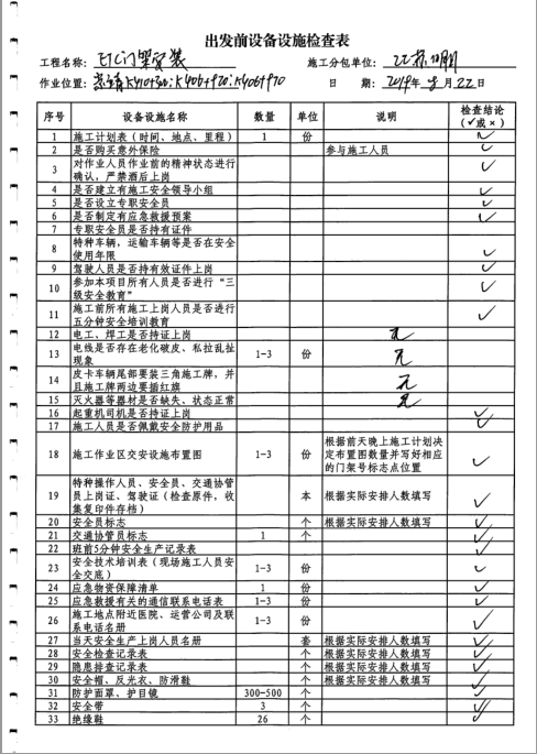 二是安全檢查更加全面,公司安全管理部針對現(xiàn)場暴露的安全隱患細(xì)項(xiàng)進(jìn)行規(guī)整,制定了《安全設(shè)施檢查表》、《施工作業(yè)現(xiàn)場檢查表》、《離場檢查表》等安全防護(hù)措施表單,細(xì)項(xiàng)多達(dá)101條,要求現(xiàn)場安全員對標(biāo)對表查漏補(bǔ)缺,盡可能做到不留隱患、不留疑問,有效提升了安全工作的計劃性和交安設(shè)施擺放效率。