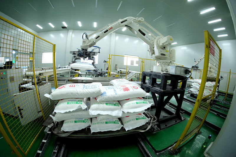 我院自主研發(fā)的全自動包裝碼垛機(jī)器人生產(chǎn)線可用于制糖、食品、飼料、化肥、淀粉、化工、醫(yī)藥、納米碳酸鈣等行業(yè)粉料、顆粒物料的傳統(tǒng)套裝式可分離內(nèi)外袋自動化包裝,實(shí)現(xiàn)將內(nèi)袋封口后置入外袋,然后自動縫合外袋,包裝全密封,無針眼,屬世界首創(chuàng)。